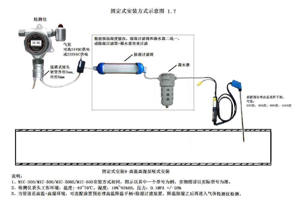 采樣單元采集現場的被測氣體,預處理單元對氣體進行除濕、過濾粉塵,并將被測氣體的濕度恒定在一定范圍,處理后的氣體接入我司MIC-500-CO檢測儀(配流通接頭)進氣口,進行實時監(jiān)測并顯示在儀器上,并通過信號接口將數據進行傳輸到客戶的監(jiān)測系統進行數據監(jiān)控。