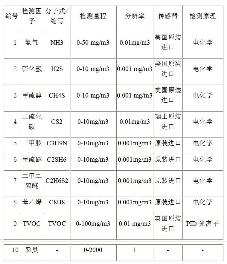 TH-2000-OU惡臭在線監(jiān)測系可同時監(jiān)測《惡臭污染物排放標準(GB14554-1993)》規(guī)定的控制惡臭物質(zhì)包括臭氣在內(nèi)的九種指標(氨氣、三甲胺、硫化氫、甲硫醇、甲硫醚、二甲二硫、二硫化碳、苯乙烯、臭氣),可選配外加PM2.5、PM10、溫度、濕度等參數(shù)指標;工業(yè)級高精觸摸屏,完美顯示當前濃度值、最大值、最小值、1分種和1小時平均值,并可選取任意時間段時間歷史數(shù)據(jù)查詢,曲線顯示;內(nèi)置大容量存儲芯片,可輕松存儲10萬以上數(shù)據(jù),并通過專用接口數(shù)據(jù)導出;逸云天專利技術(shù)的預(yù)標定智能型氣體傳感器,即插即用,方便維保、更換;機箱采用戶外專用納米防護涂層技術(shù),耐日曬雨淋、隔熱、防蚊蟲,可在戶外長期使用;兼容TCP、IP、MODBUS 等通信協(xié)議,即可無線數(shù)據(jù)上傳對接當?shù)丨h(huán)保局,也可有線遠傳組網(wǎng)。