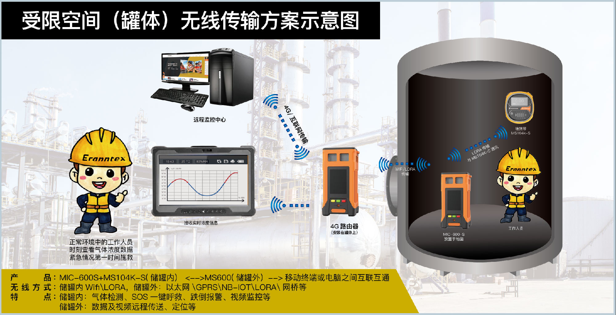 作業中,監測主機在受限空間外。施工工人佩戴一臺便攜式檢測儀PTM600-S進行作業,隨時檢測所處環境的氣體濃度狀況,外邊監護人員可通過手機或ipad進行查看監測數據。必要時,可在內部增加中繼設備延長傳輸距離。